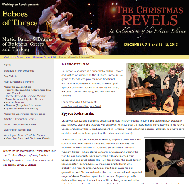 Spyro performs regularly at the Washington Folk Festival and other venues in the Washington DC Metropolitan area and internationally. He has performed as a solo performer and with various groups for organizations such as the Greek Archdiocese of North America, the US Department of State, Washington DC area cultural and philanthropic organizations, the Embassies of Greece, Cyprus, and the EU, the University of Maryland, and the US Library of Congress.