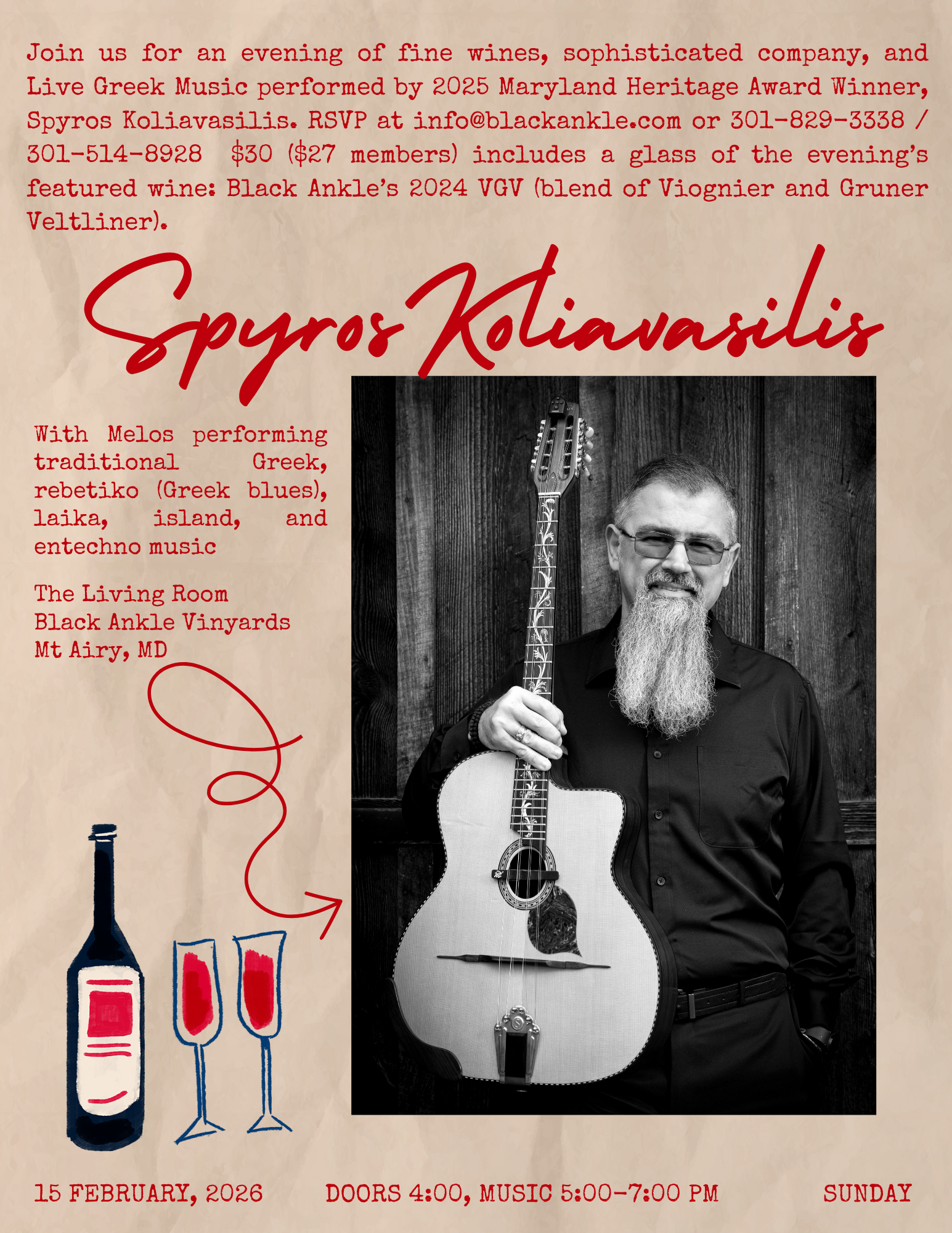 - February 15th, 2026 – Spyros Koliavasilis in concert with Melos, The Living Room at Black Ankle Vinyards, Mt. Airy, MD. Doors open at 4:00, music from 5-7 p.m. Tickets $30 ($27 for members) and includes a glass of Black Ankle’s featured wine for the evening. To reserve a table contact: info@blackankle.com 301-829-3338 / 301-514-8928 14463 Black Ankle Road, Mt. Airy, MD 21771 View Flyer